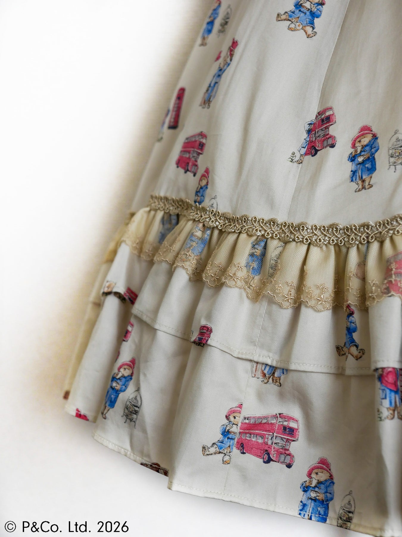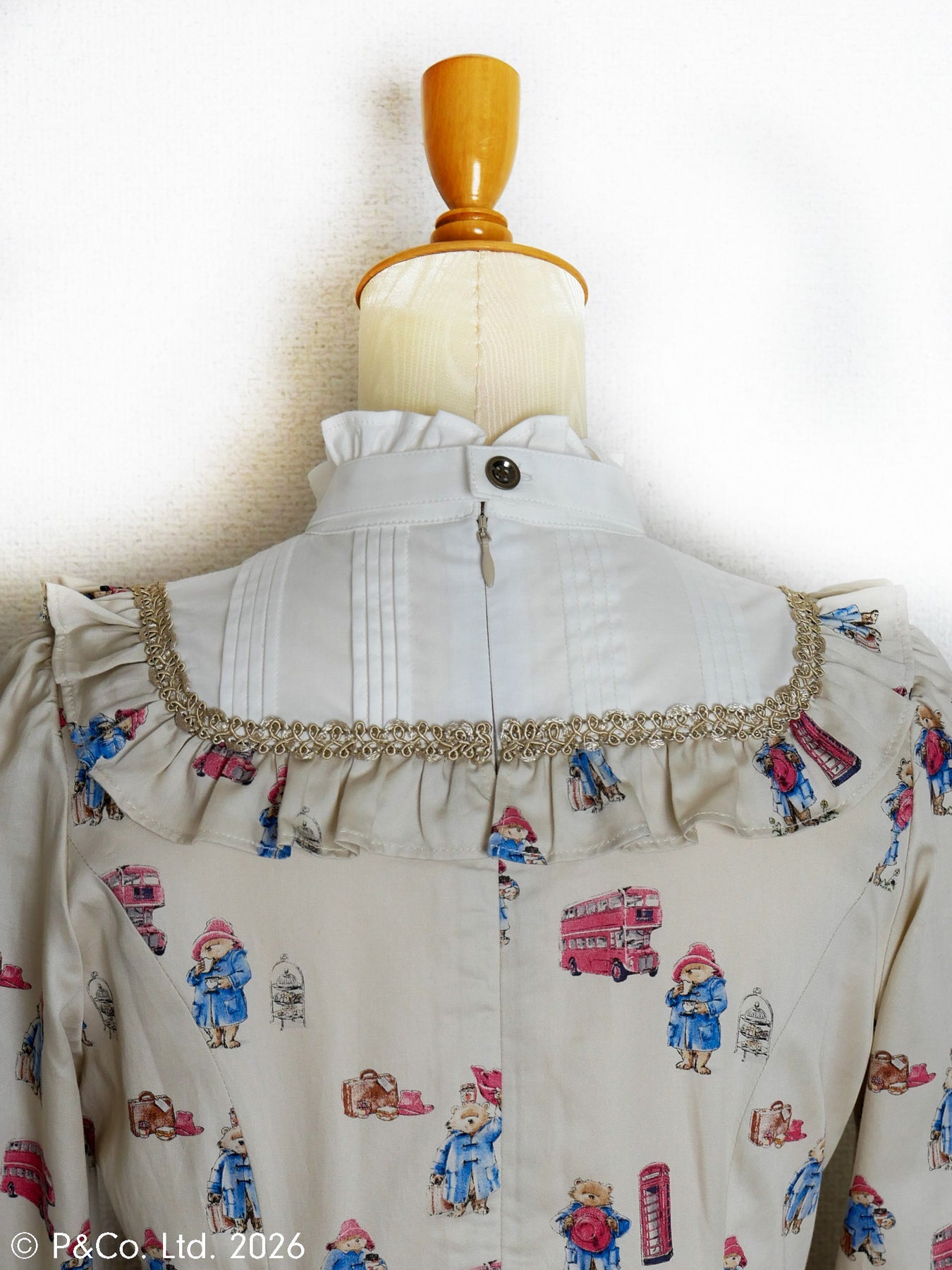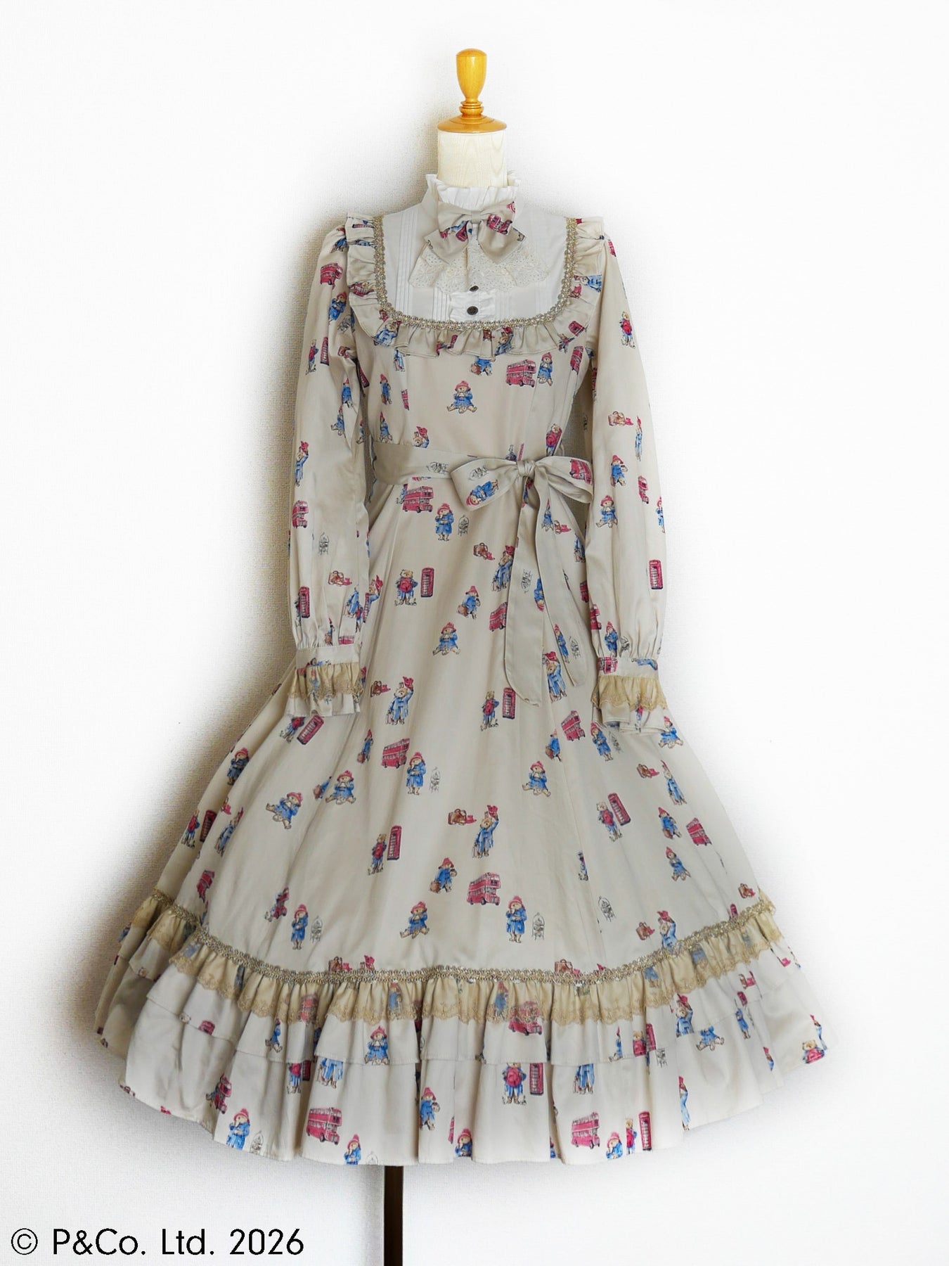 沢山のポーズのパディントンとロンドンモチーフがちりばめられたオリジナルテキスタイルを使用しお仕立てした、英国の物語とVictorian maidenが誇る伝統が重なり合うクラシカルドールドレスです。