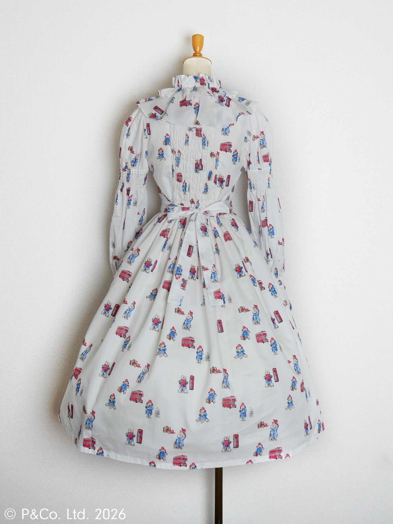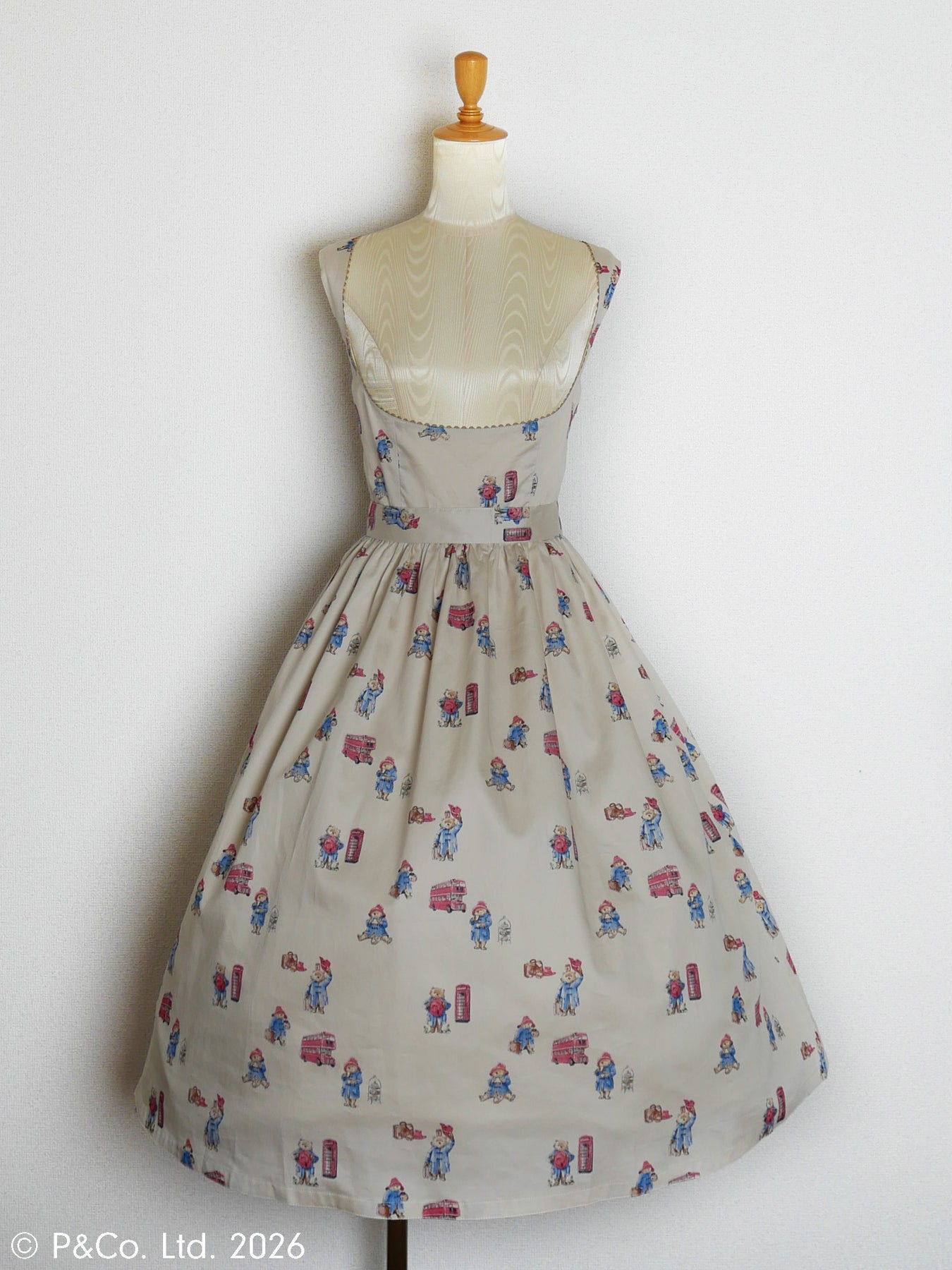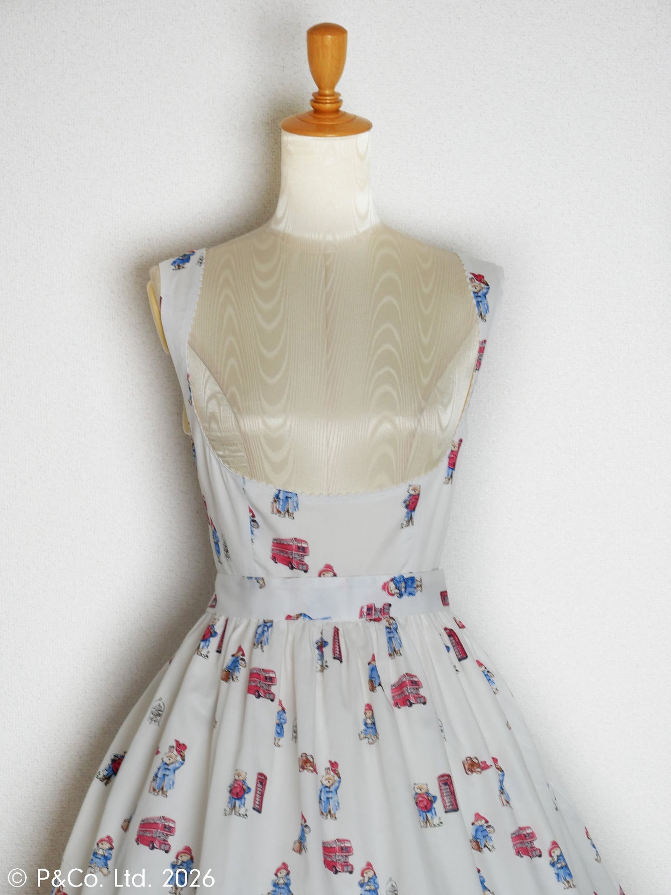 沢山のポーズのパディントンとロンドンモチーフが散りばめられたオリジナルテキスタイルを使用した、大きく開いた胸元が印象的な、Victorian maidenならではのエプロンドレス。