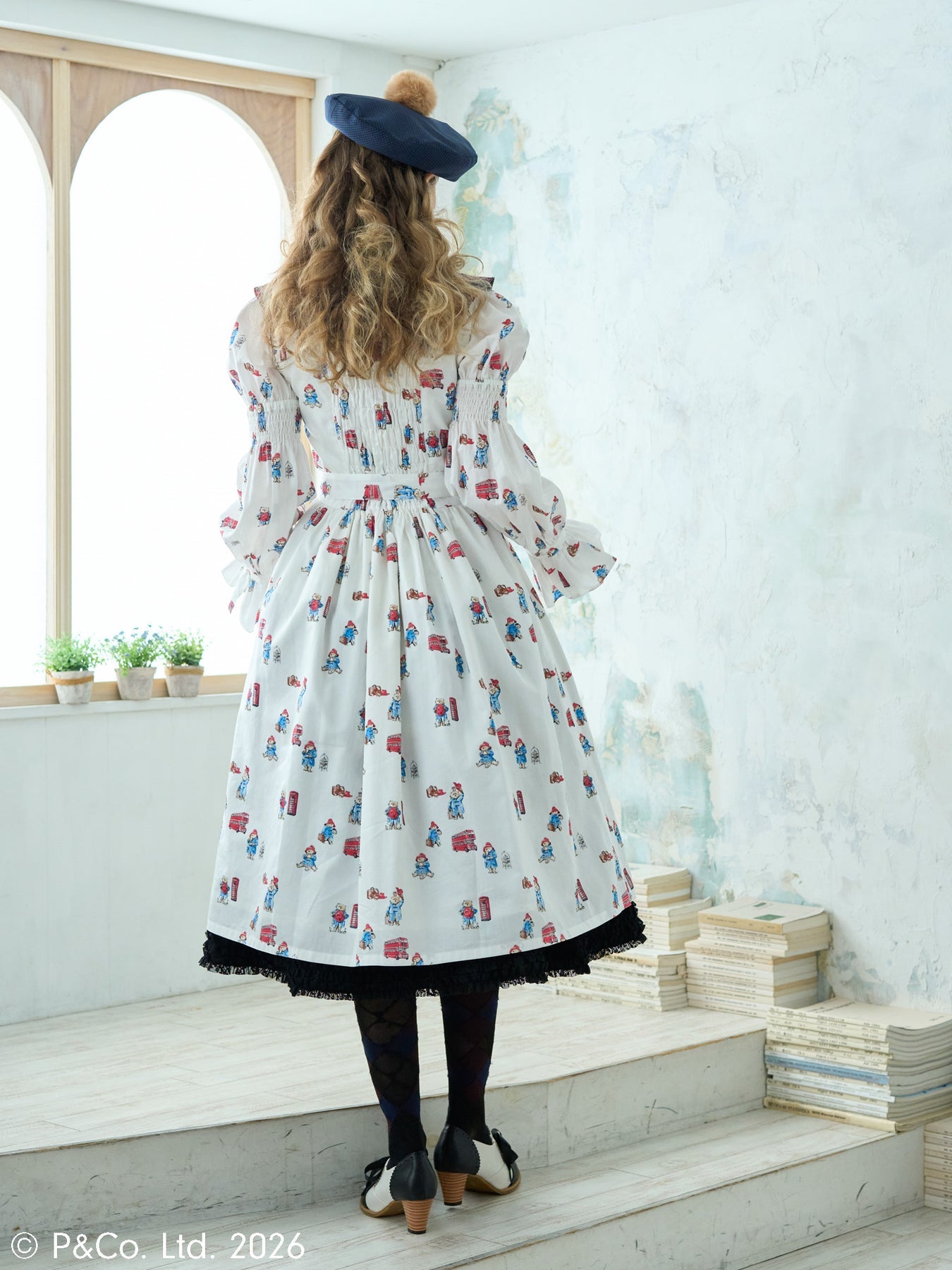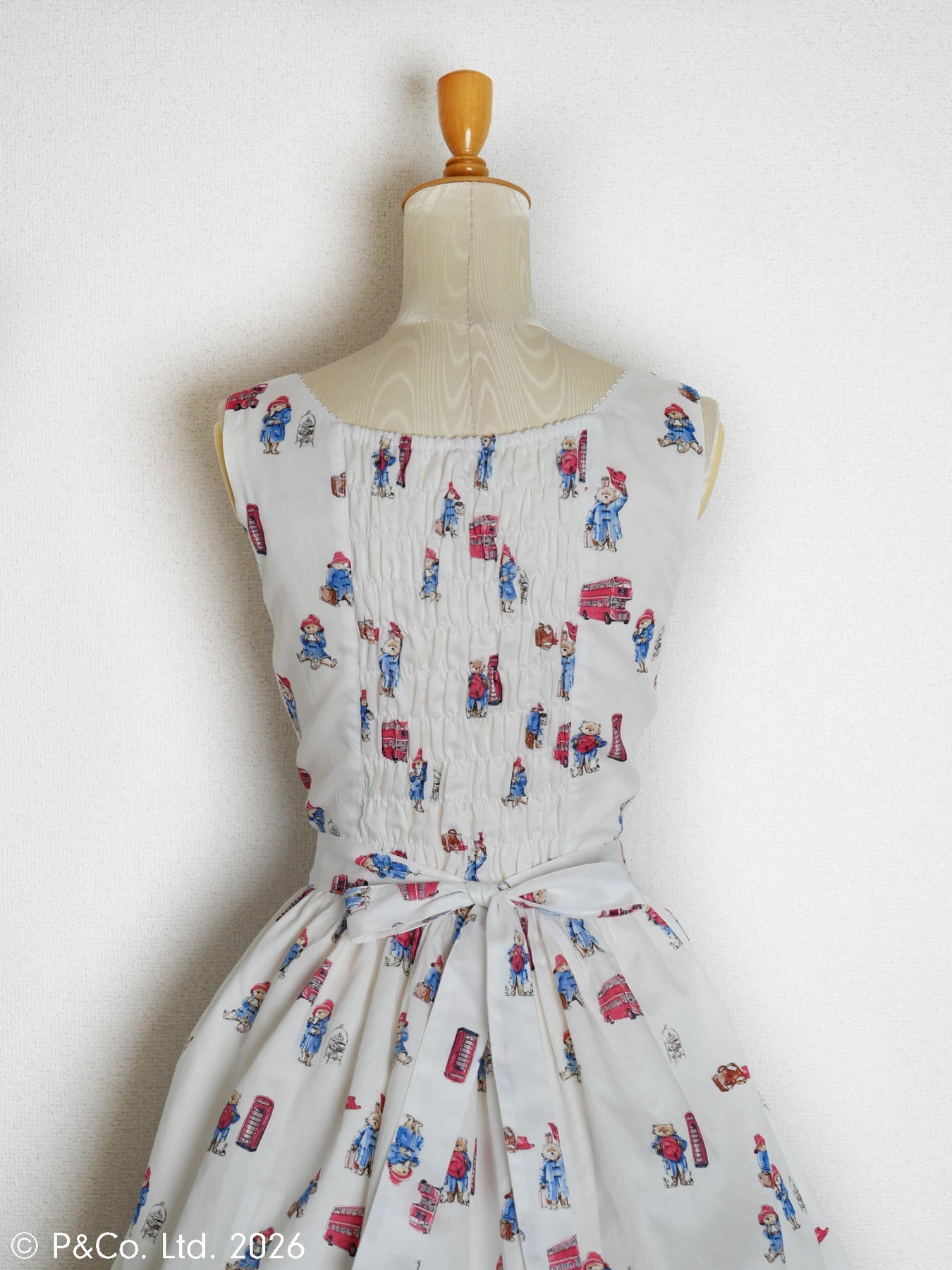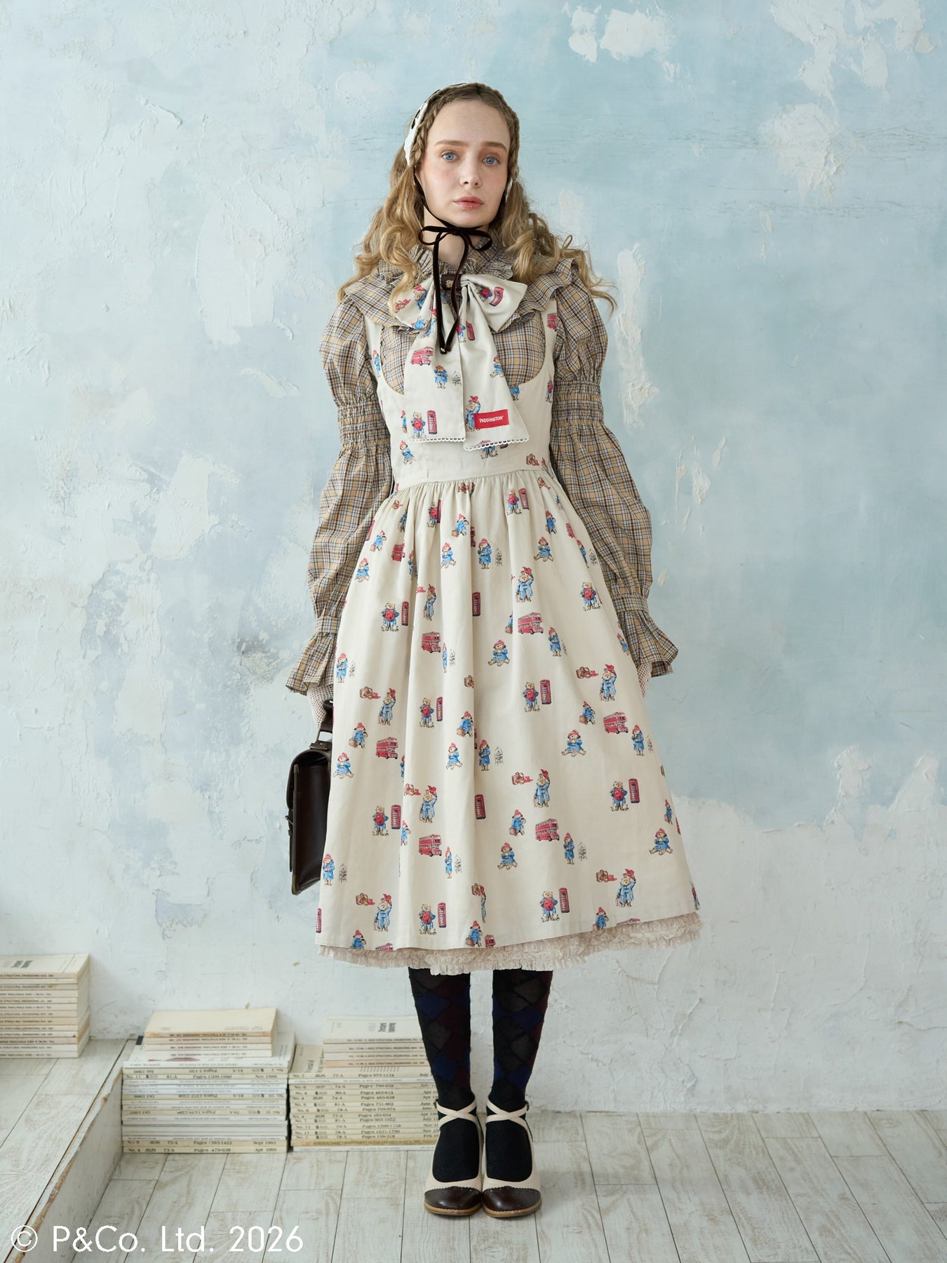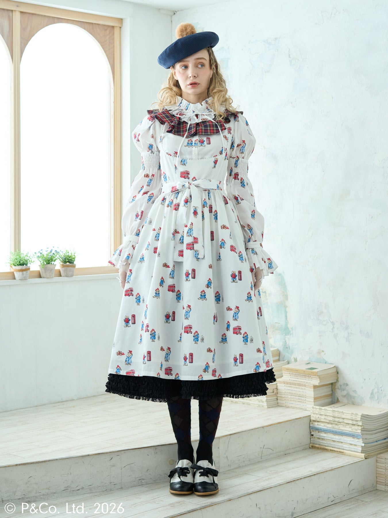 沢山のポーズのパディントンとロンドンモチーフが散りばめられたオリジナルテキスタイルを使用した、大きく開いた胸元が印象的な、Victorian maidenならではのエプロンドレス。
