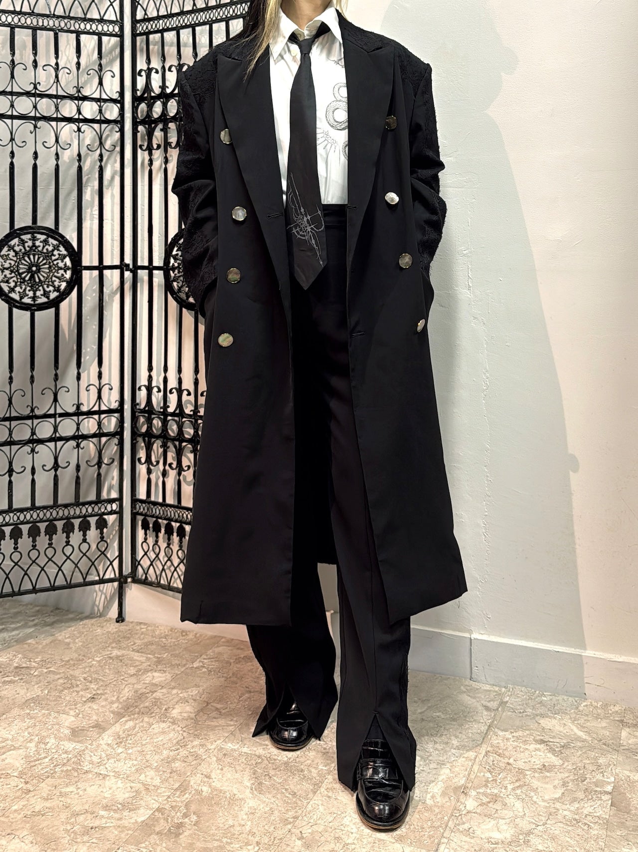 肩パッド入りで、オーバーサイズなのでエレガントながらマニッシュな雰囲気に仕上がりました。