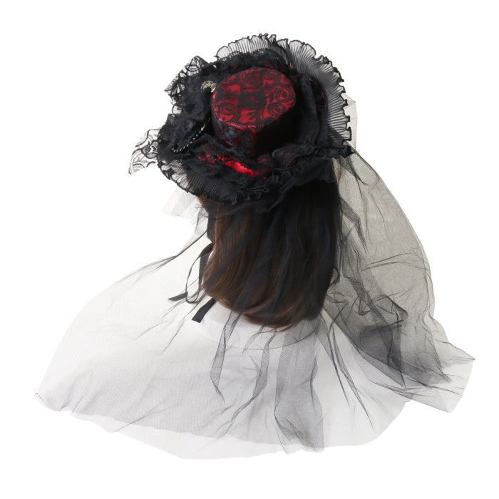 【USED】2連パールリボン付きベール帽子:赤×黒レース×黒パール