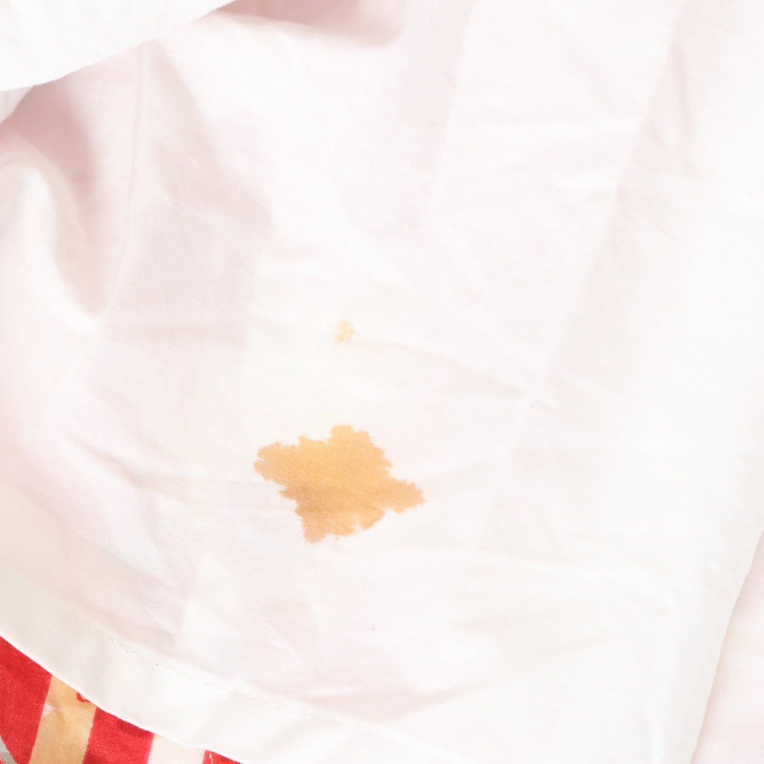 前面左裾・左裾付近裏地に多数の目立つ茶色いシミ