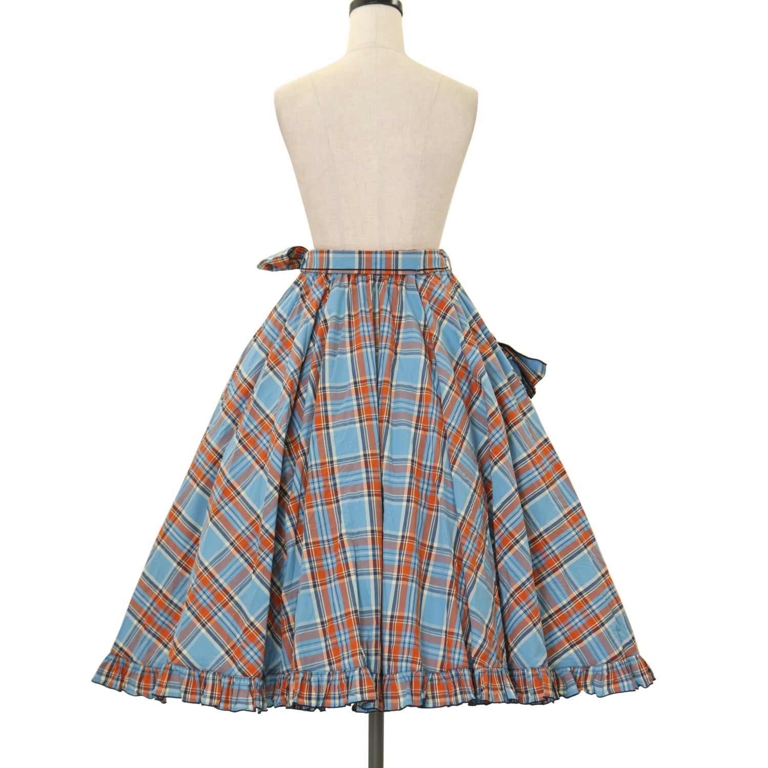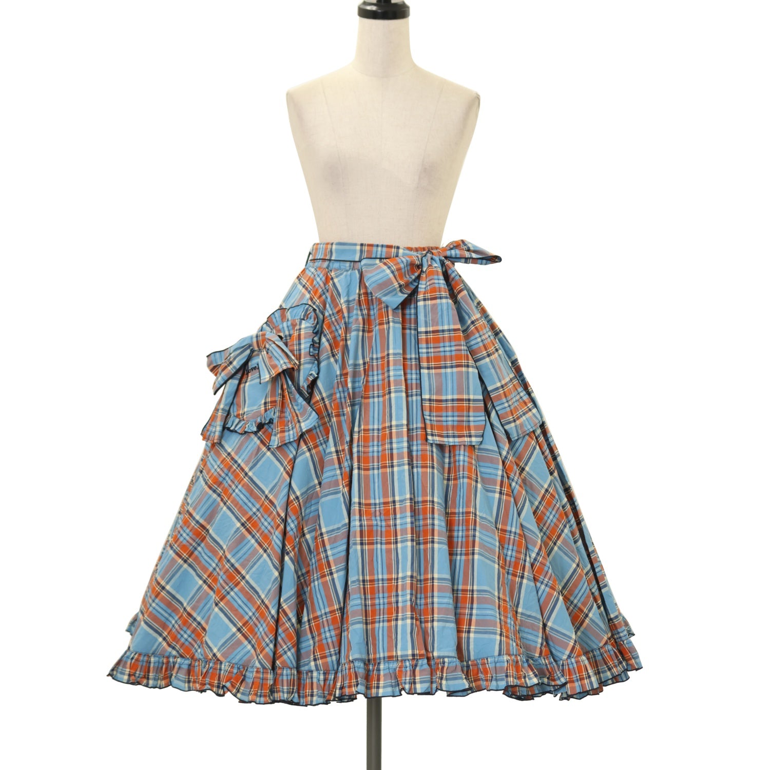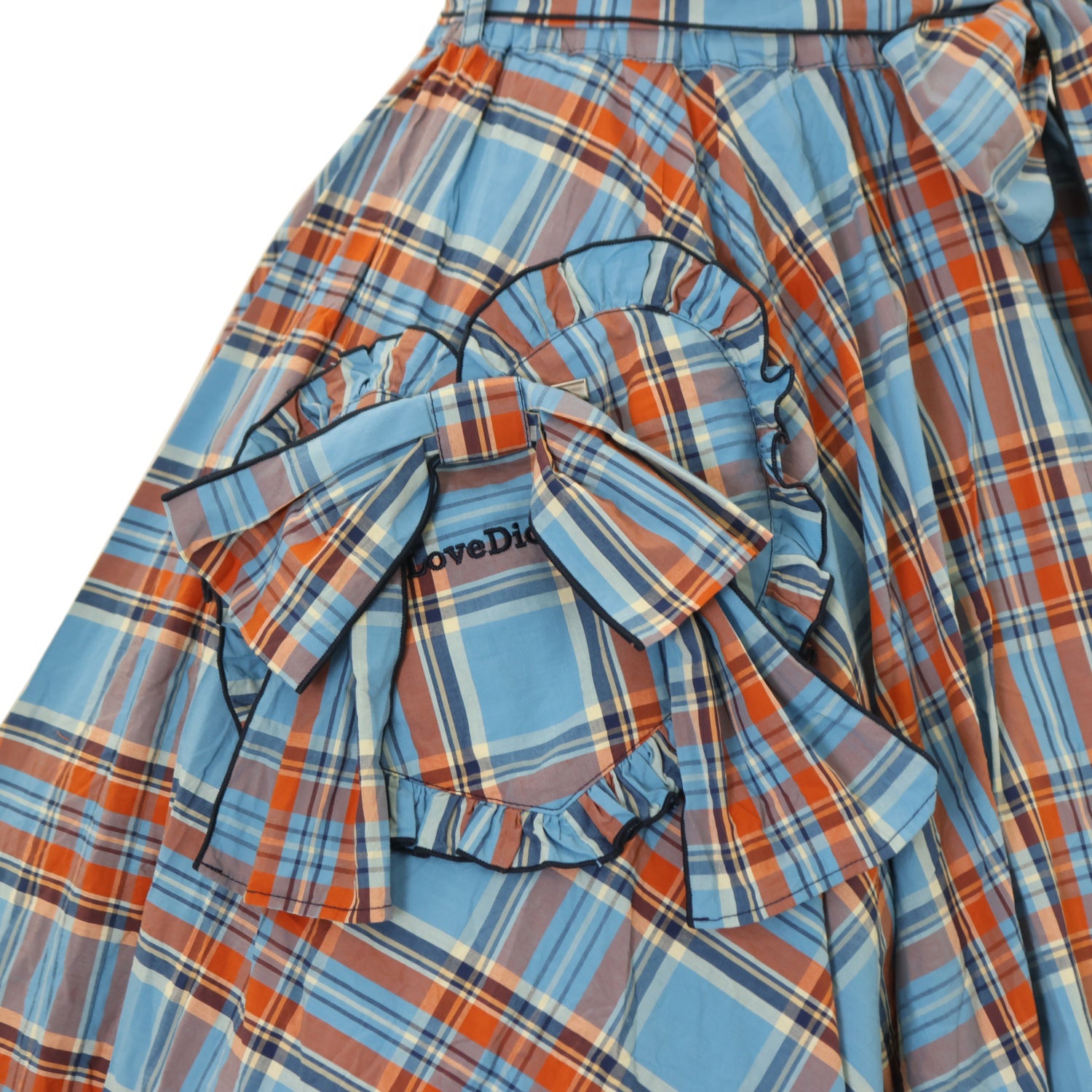 【USED】ハートポケットサーキュラースカート【水色チェック×紺刺繍ロゴ】