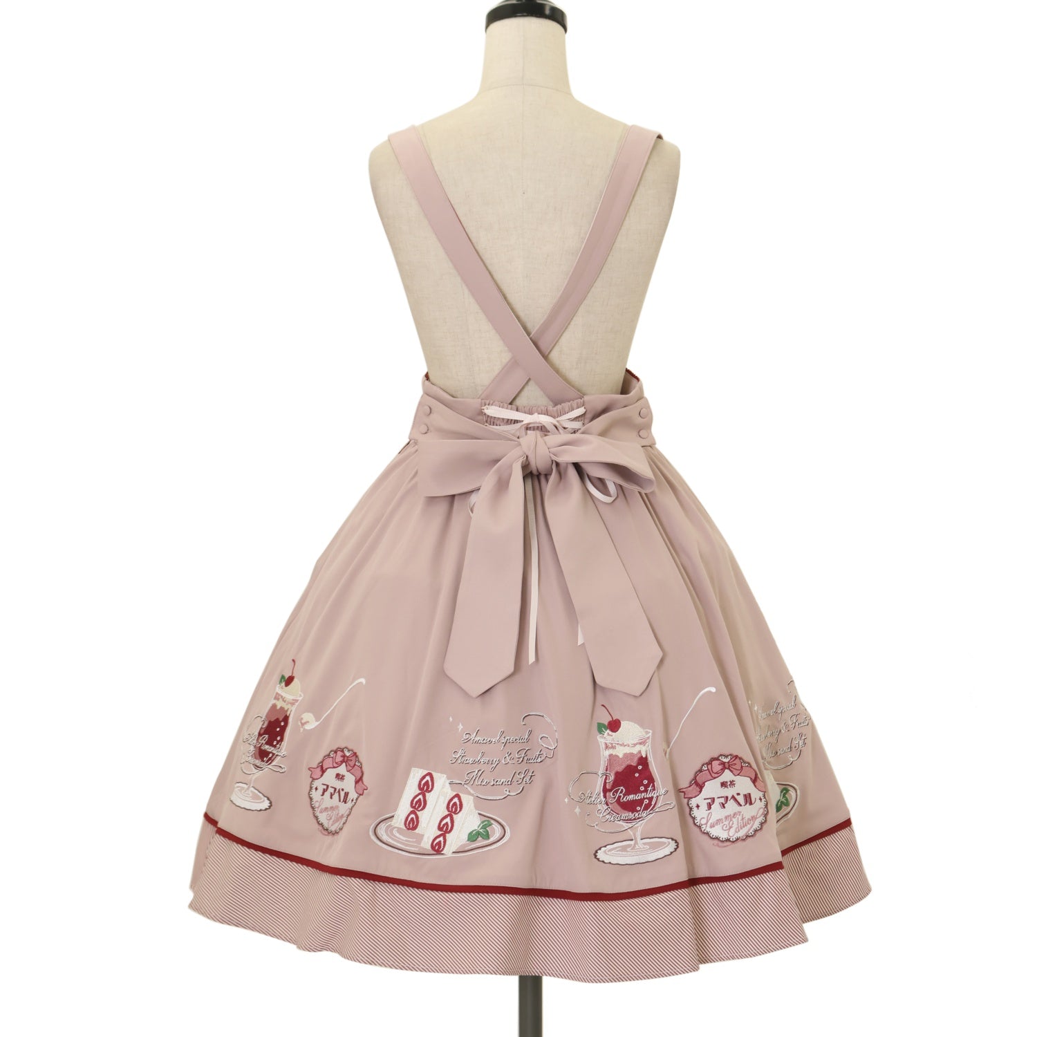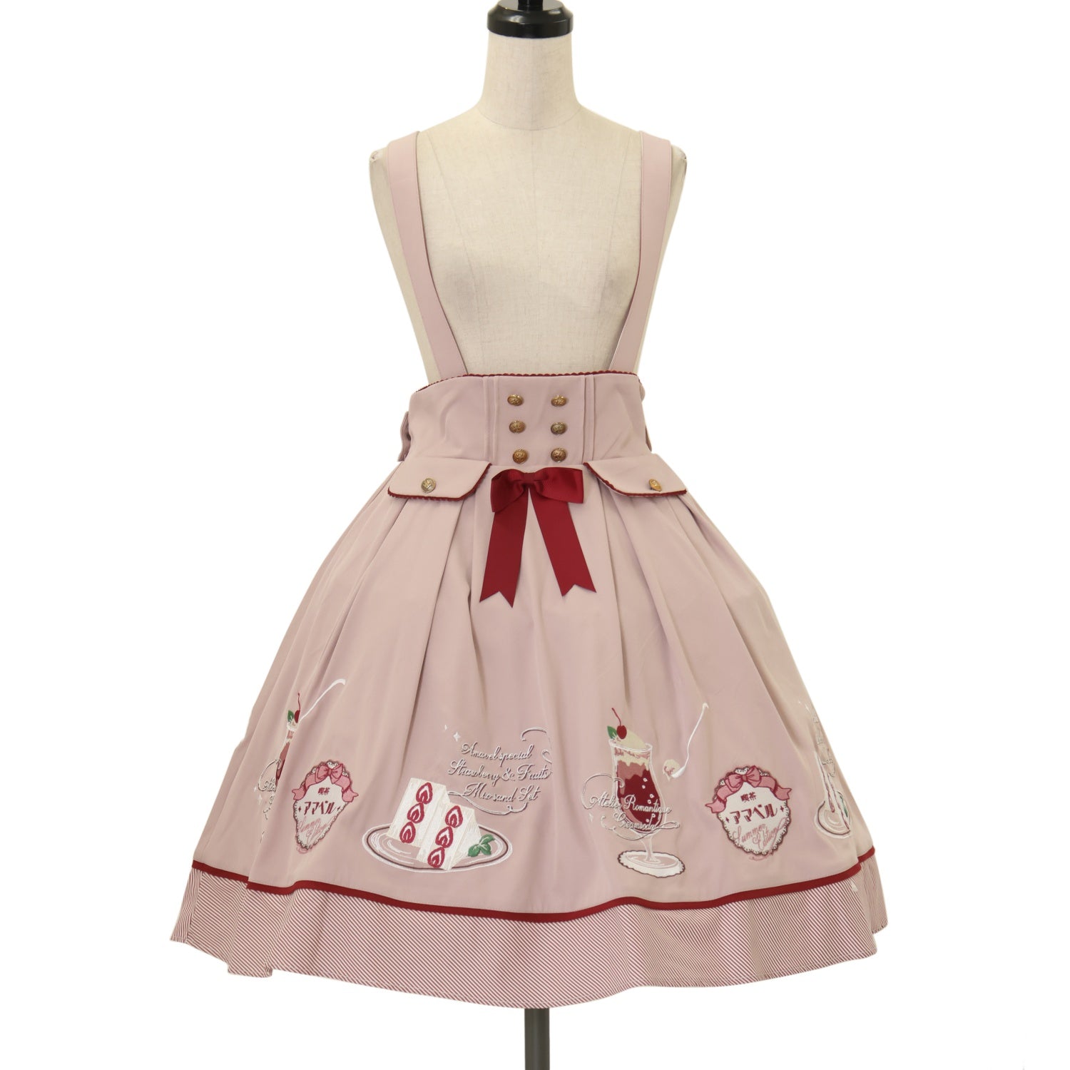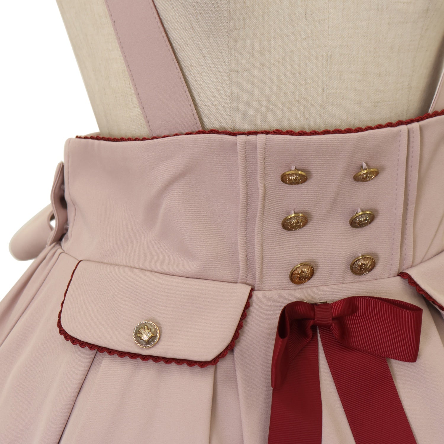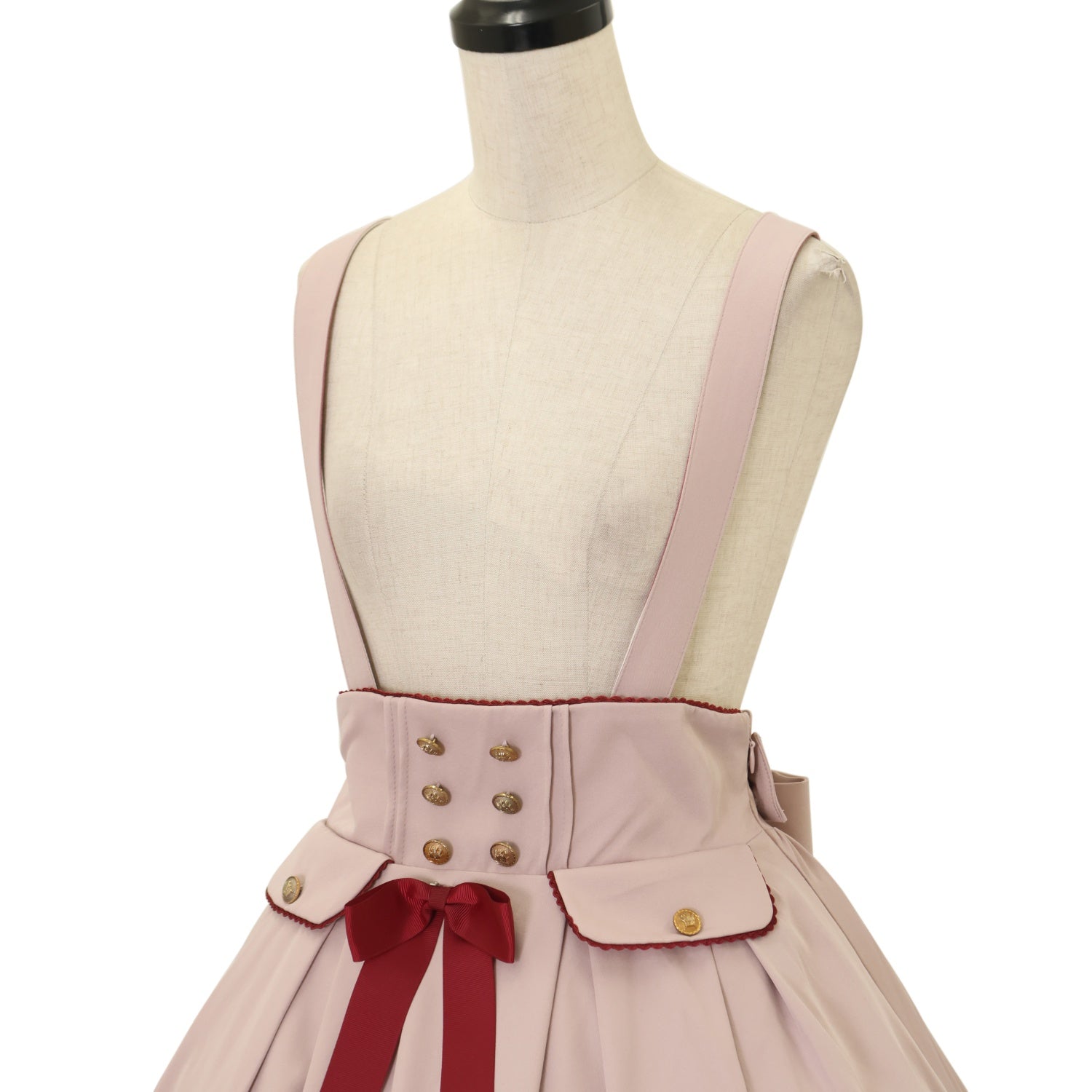 ウエスト編み上げリボンで調節可能 肩紐3段階で調節可能 前面リボンブローチ取り外し可能 |