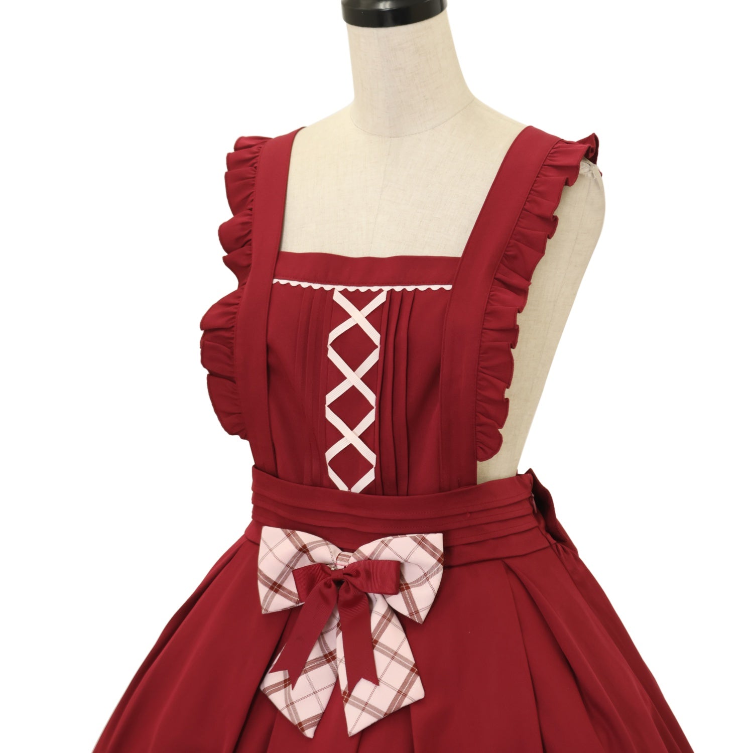 ウエスト編み上げリボンで調節可能 肩紐3段階で調節可能 前面リボンブローチ×2取り外し可能 胸当て取り外し可能 |