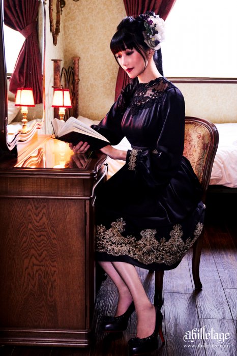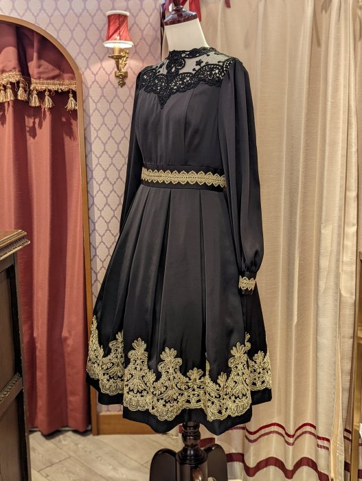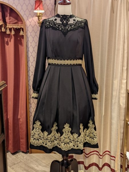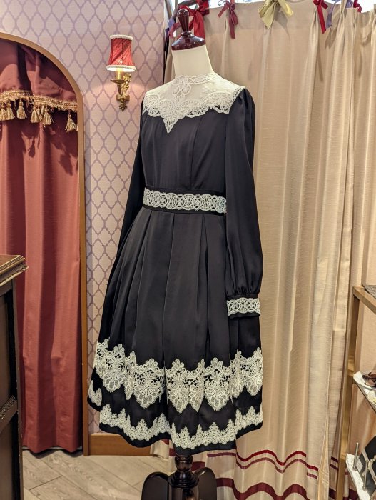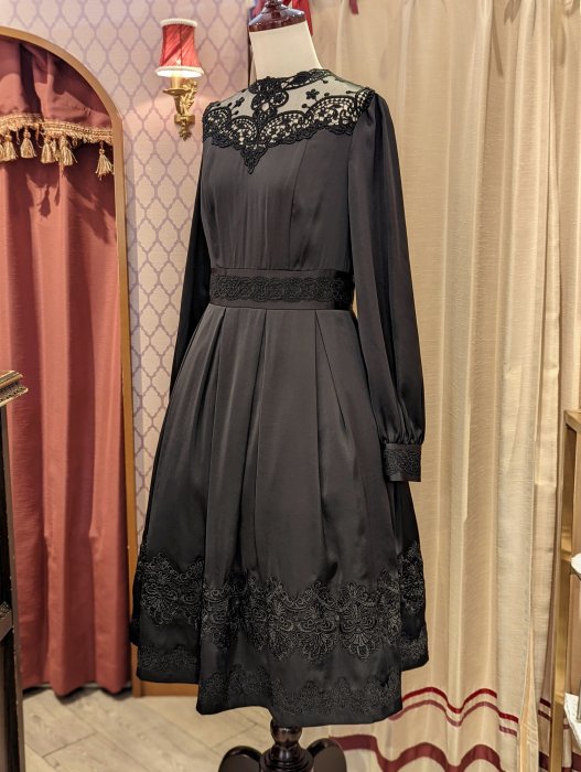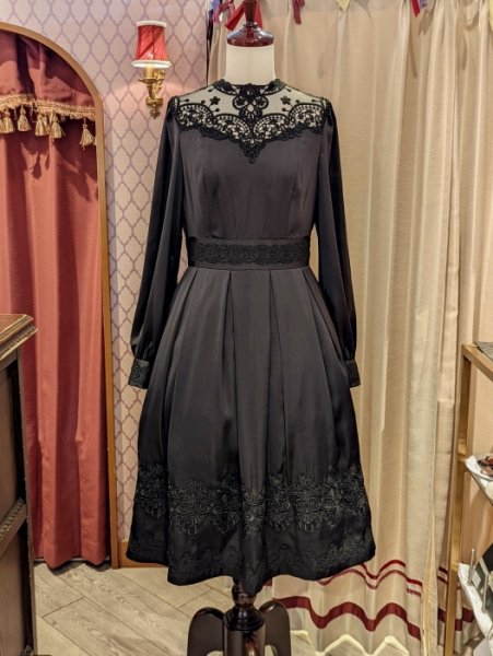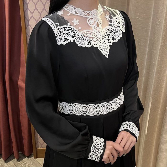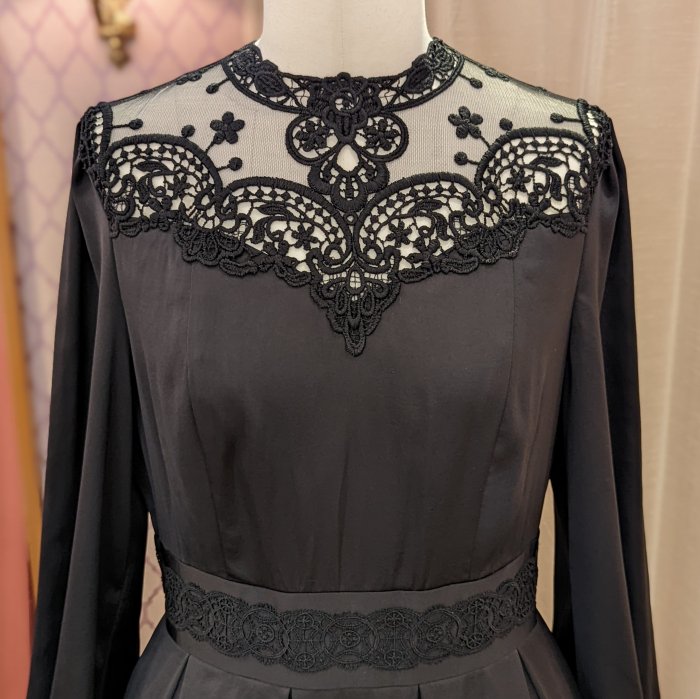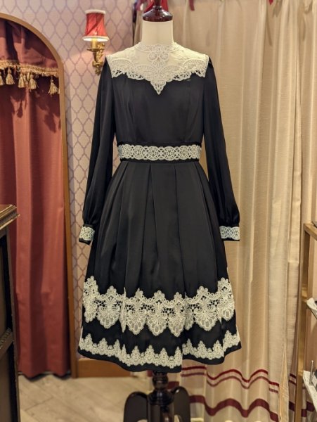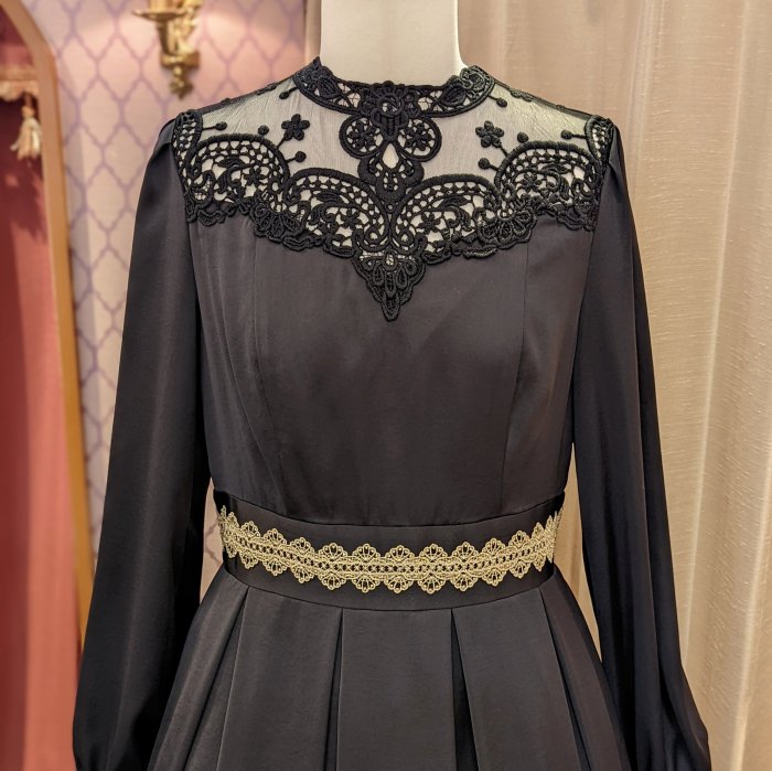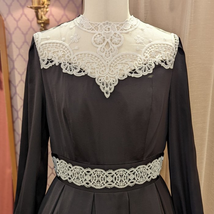 裾、胸元、カフス、デコルテ…と、象徴的な2種類のインポートレースをふんだんに配した