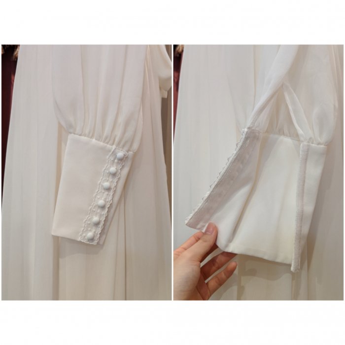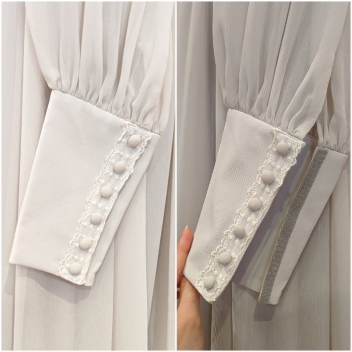 長めのカフスで留め、ゆったりとした袖をより印象的なシルエットに