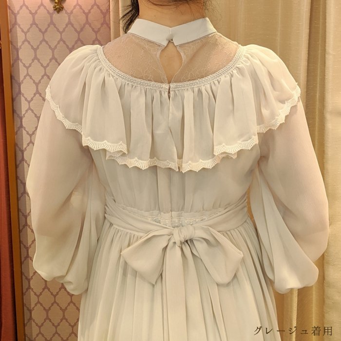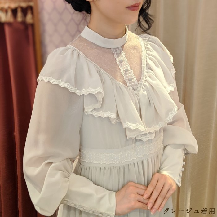たっぷりと生地を使用した幅広のフリルが胸元を彩る優雅なデザイン