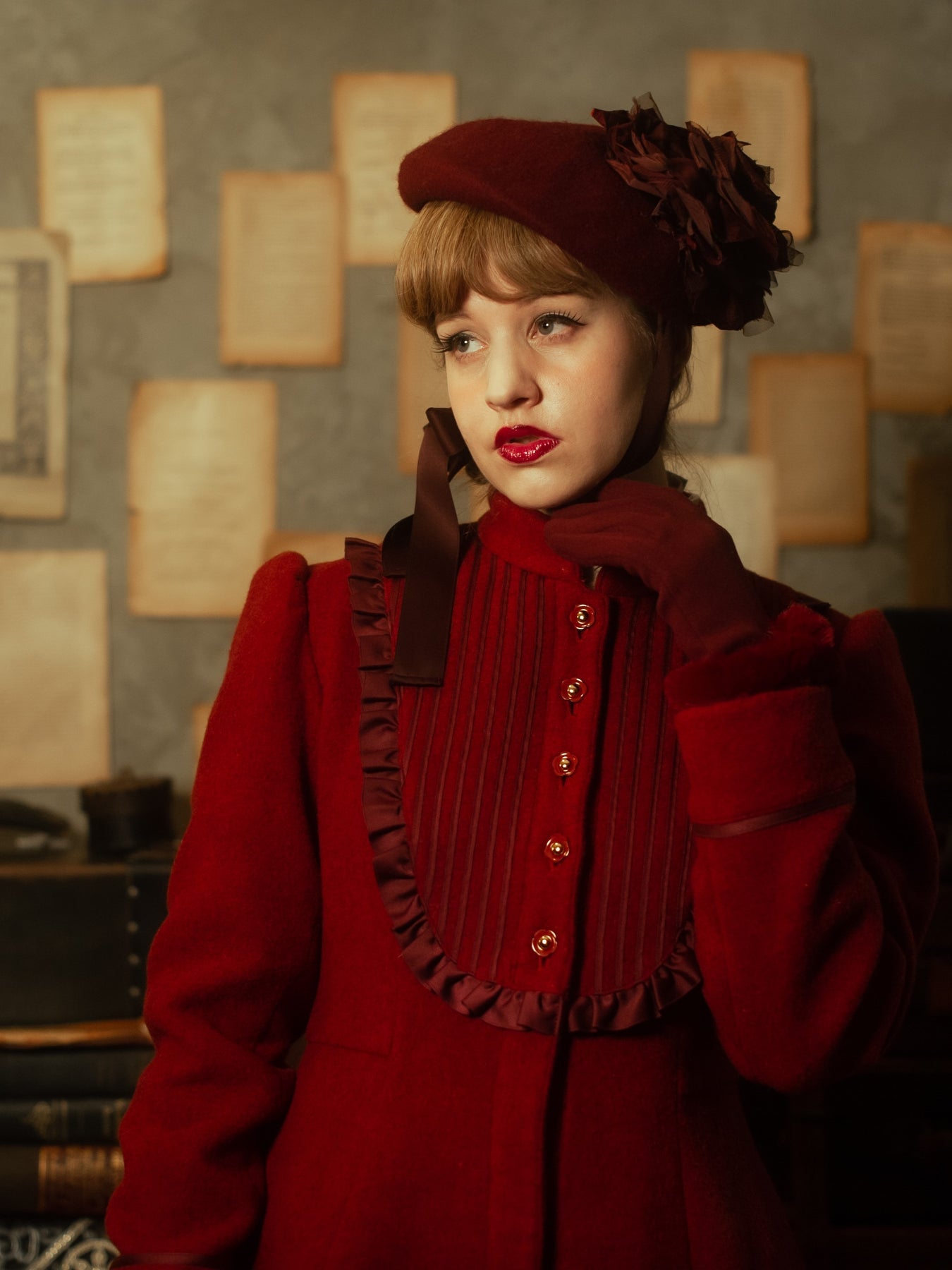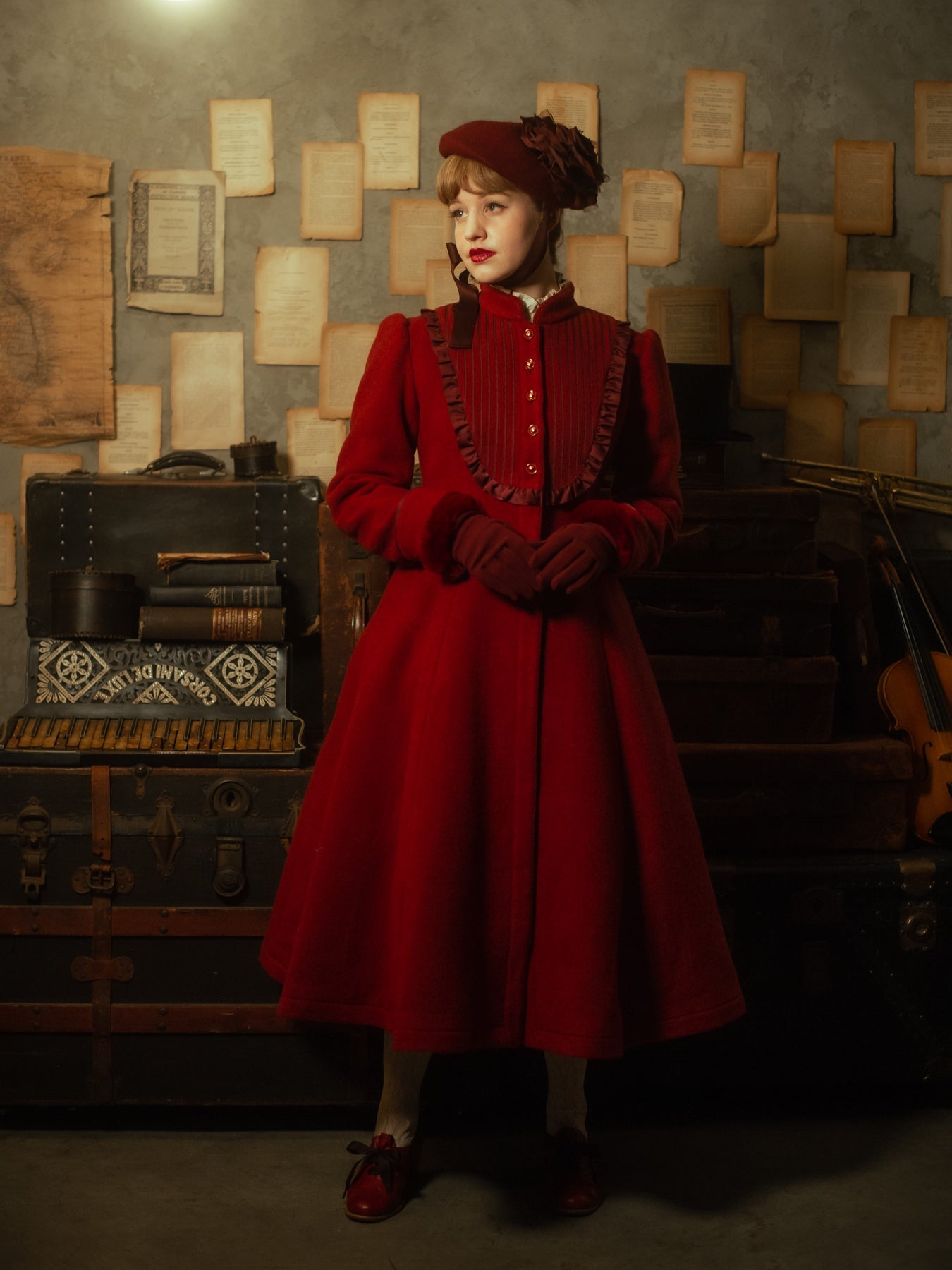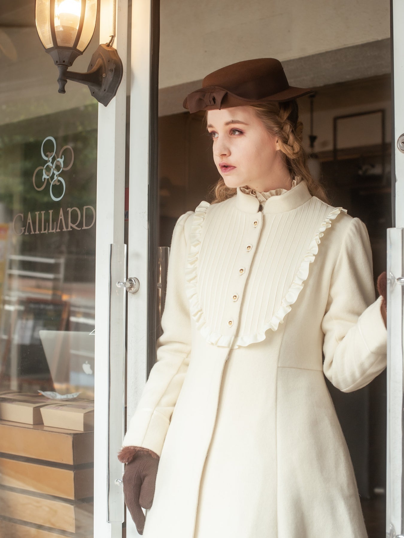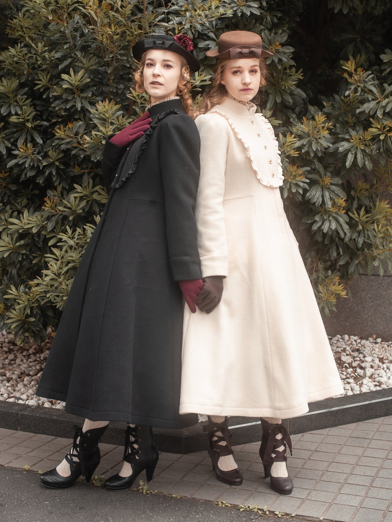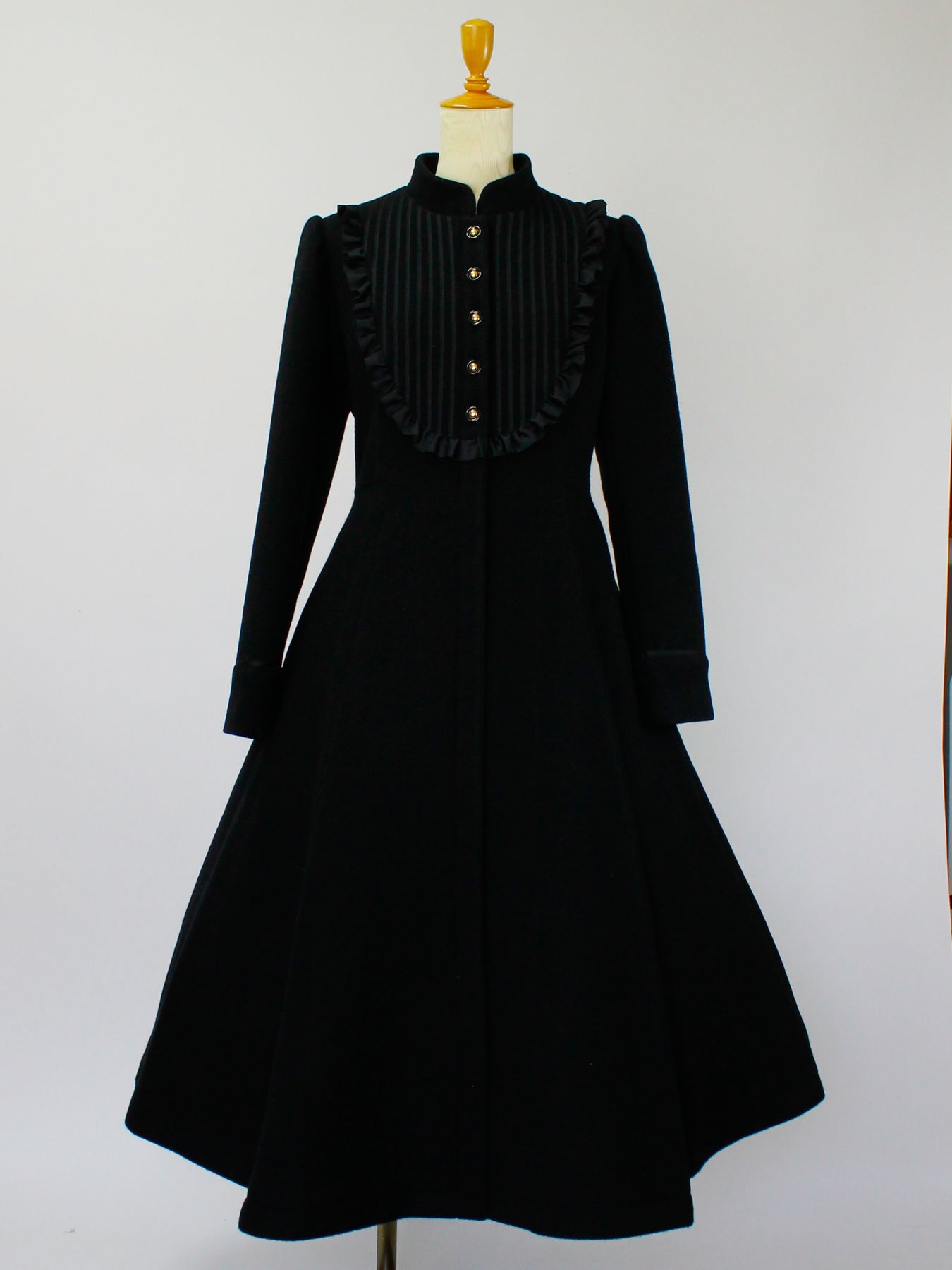 贅沢なロングパネルが特徴的なVictorianmaidenの定番的な クラシカルドールドレスがコートになったようなフルレングスコート。