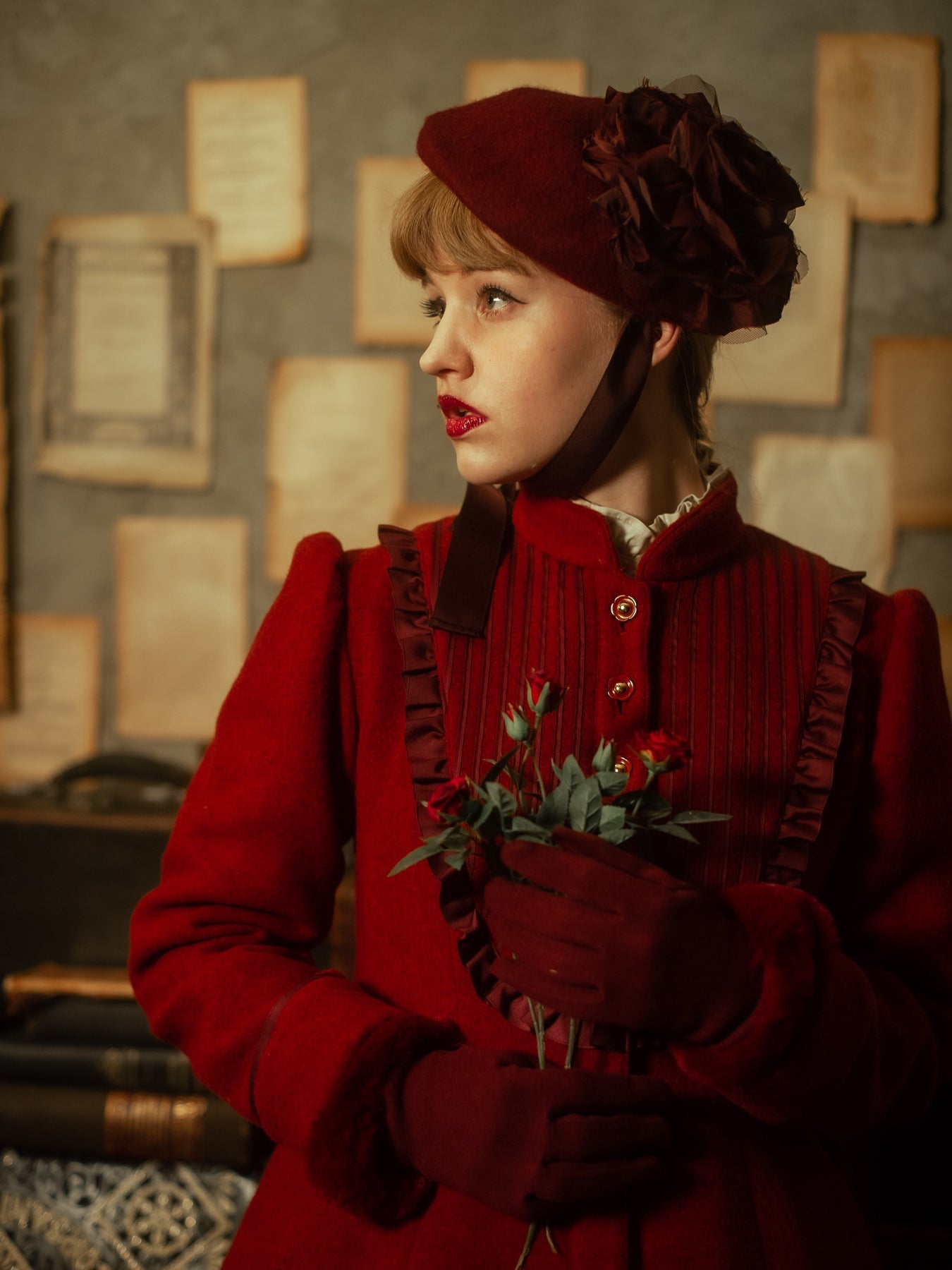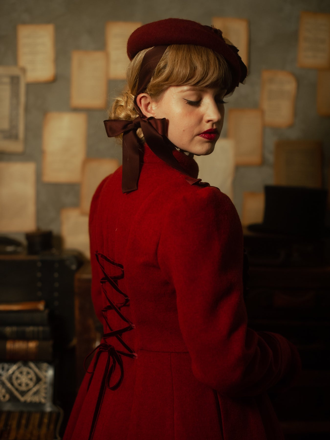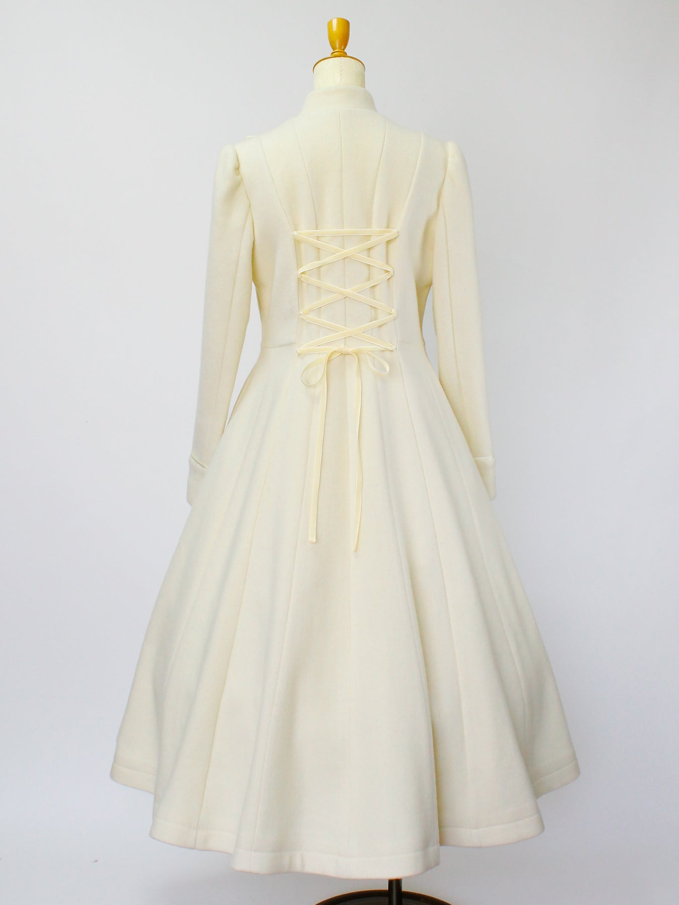 ロング丈なので暖かさや実用性も兼ね備え、背面の別珍編み上げリボンで調節いただくとスッキリしたレディライクな美しいシルエットでお召し頂けます。