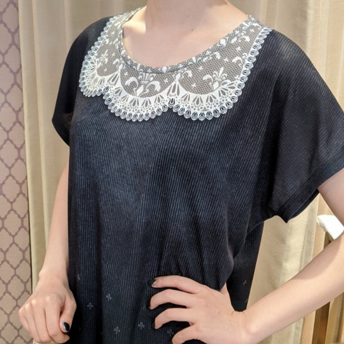 織ったような生地感のある風合い、襟ぐりと裾の白いレースが上品な印象の「ホワイトレース」