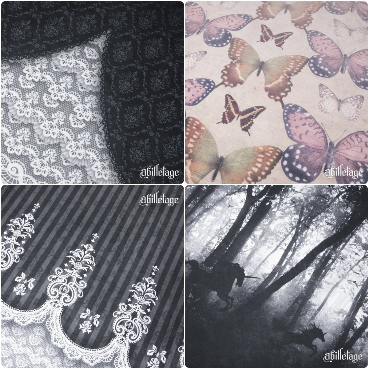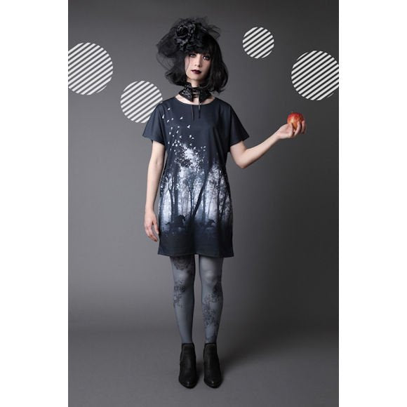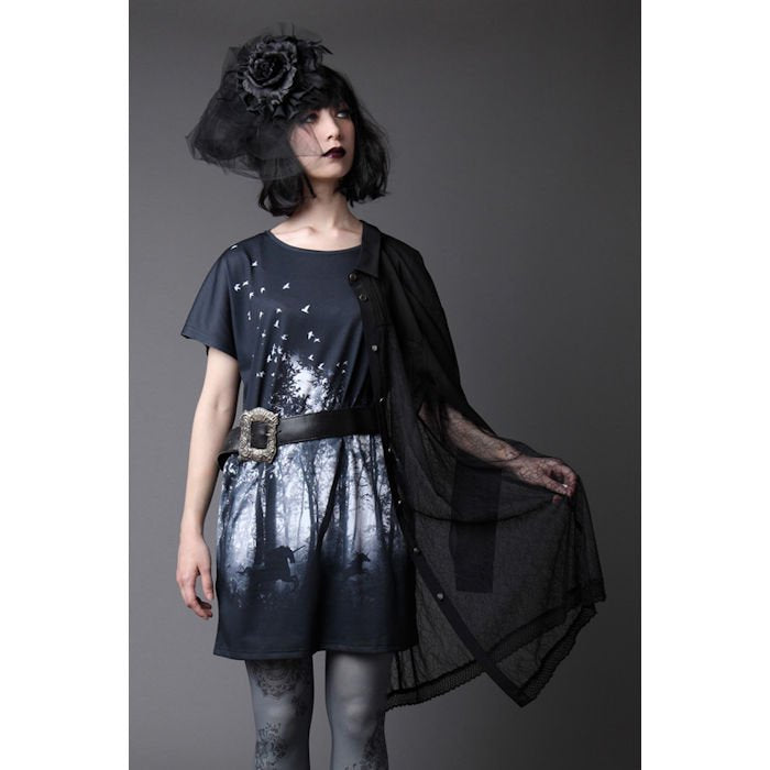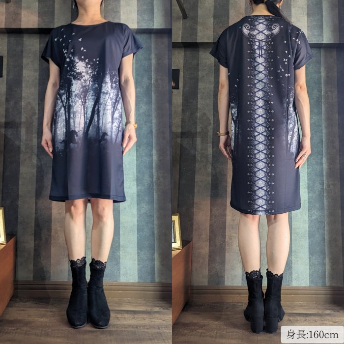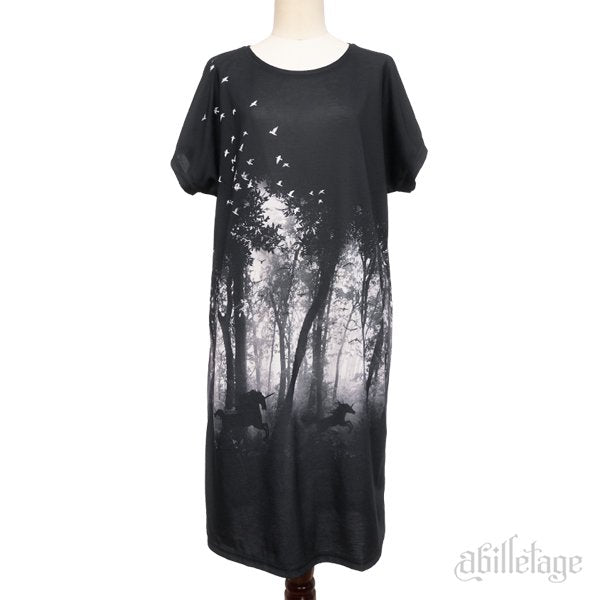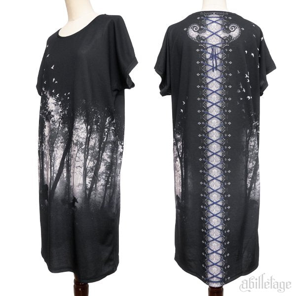 暗い森の中を駆けるユニコーンを描いた一着。背中の編み上げ部分にはレースをあしらい、編上げのリボンを際立たせます。