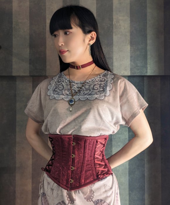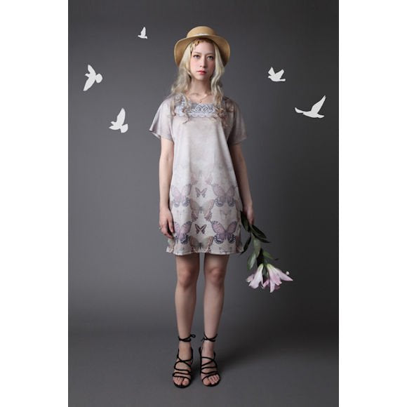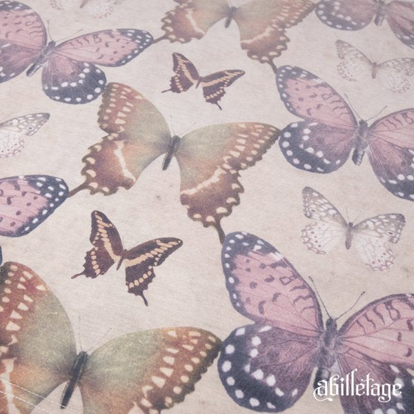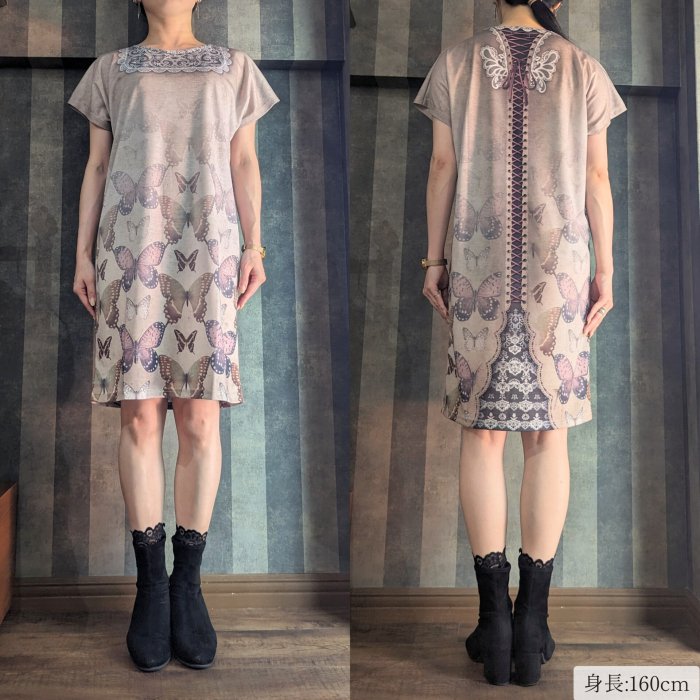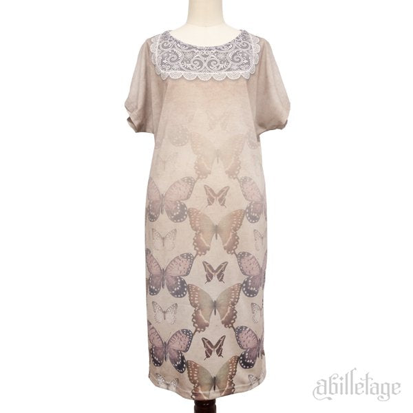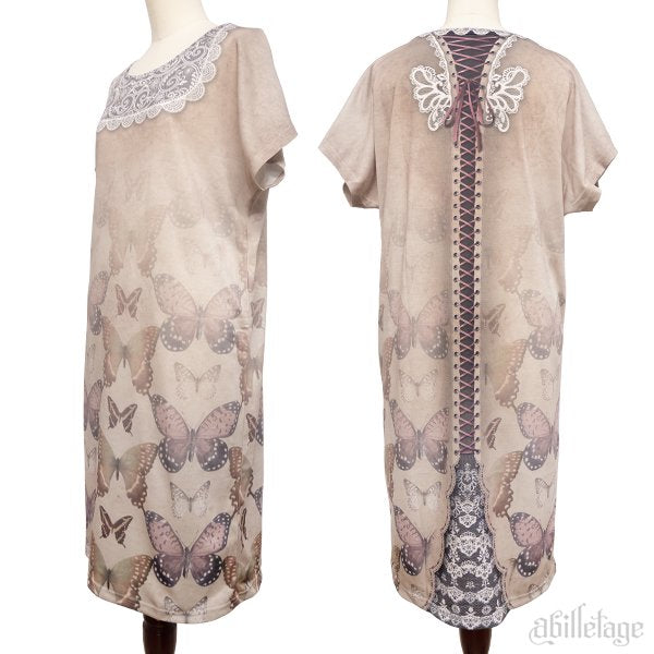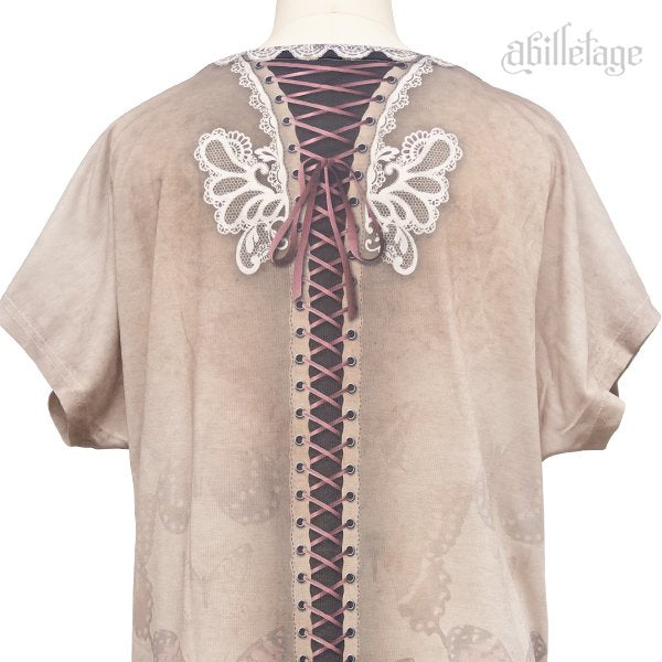 アンティークのような風合いを表現したベースに、大きめのバタフライを並べました。古い標本のようなお色味で落ち着いた印象です。背中のレースもさりげなく蝶々の形。