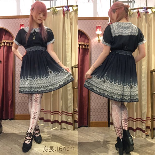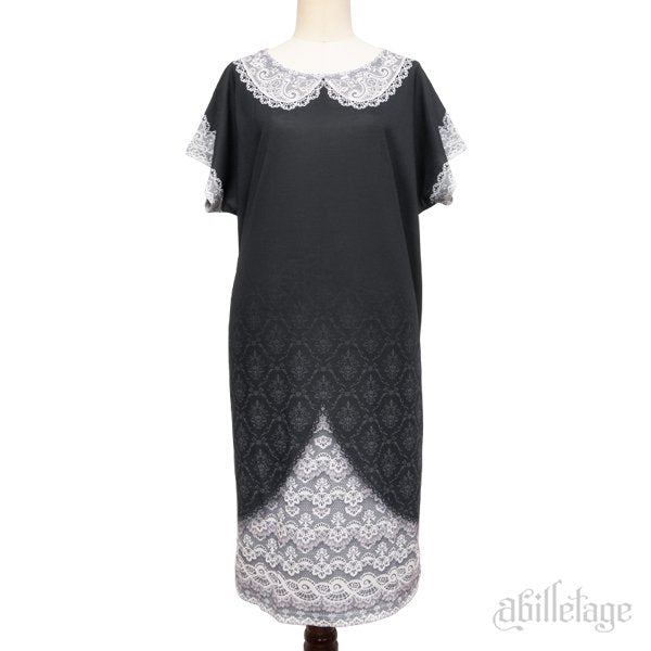 レース模様の大振りなセーラーカラーが可愛らしい一着。袖口、裾にもレースをあしらいドレッシーさをプラスしました。
