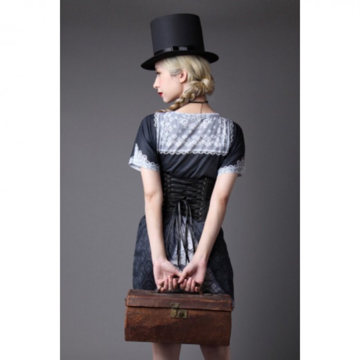 レースのボックスカラーと裾の大振りレースが可愛らしく、背中の大きな編上げが特徴的な一着です。