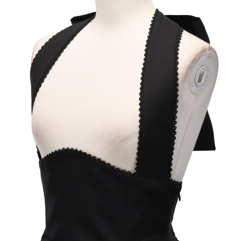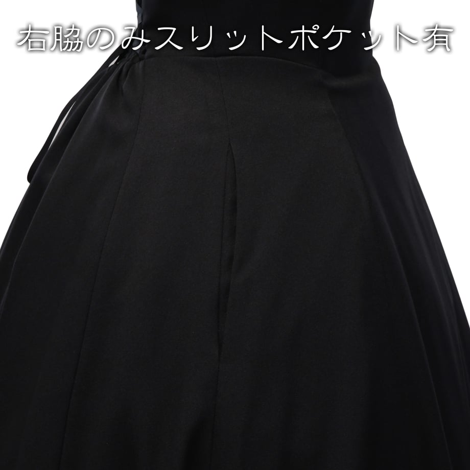 左脇ファスナーによる着脱のしやすさ、右脇にはスリットポケットを備え、実用性にも配慮しています。