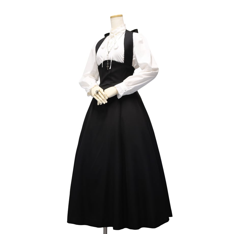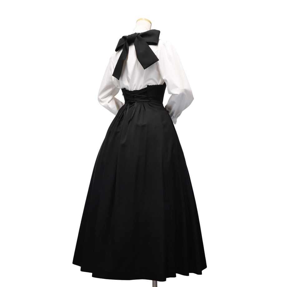 取り外し可能な肩紐によるアレンジ性や、フロントはタックやギャザーを入れずに仕立てたすっきりとしたライン、バックウエスト側のギャザーによるスカートの美しい広がりなど、仕様はジャガードタイプと同様です。
