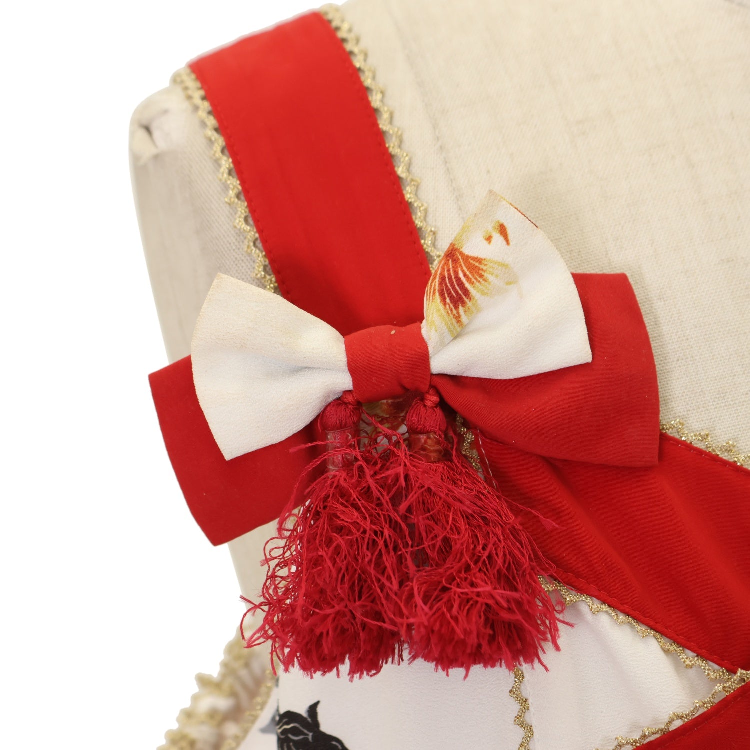 | 产品状态 | 使用感あり 複数の汚れ ウエスト縫い付けリボンに毛羽立ち リボンブローチに黄ばみ・タッセルに乱れ |
