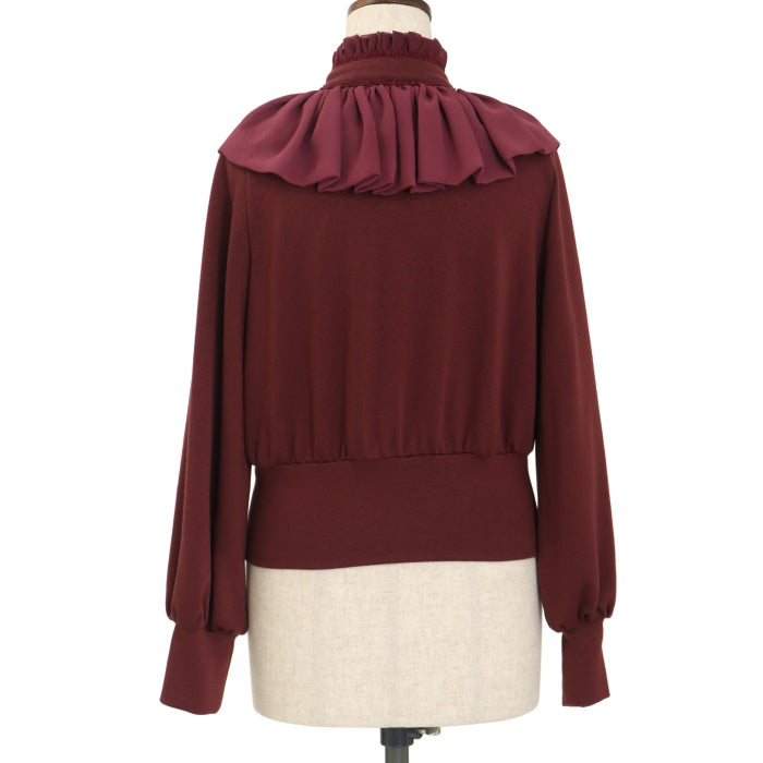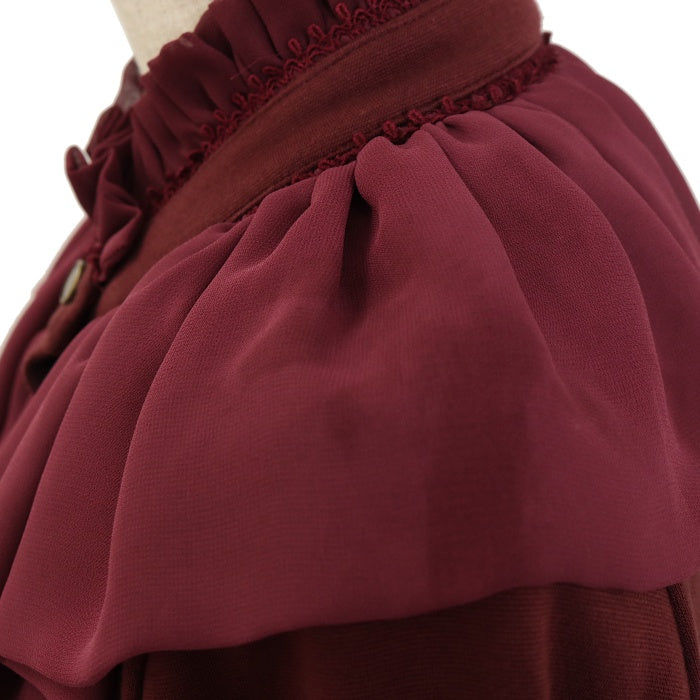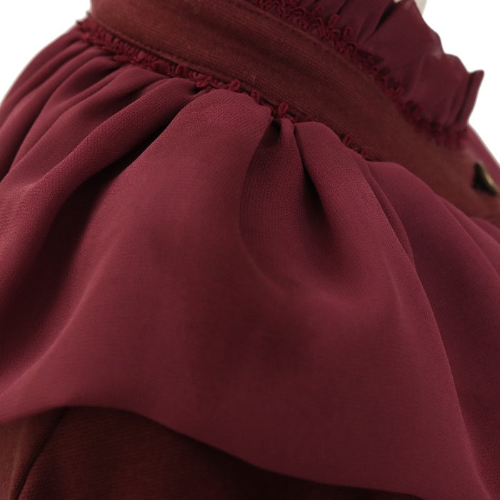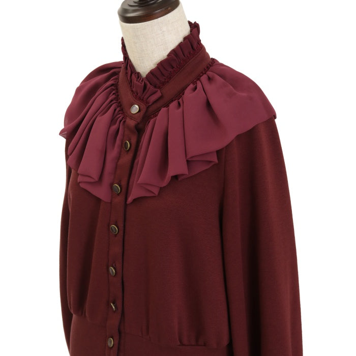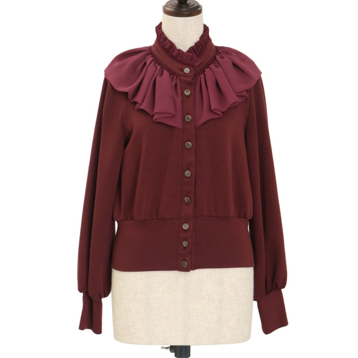 产品状态 | 使用感あり 毛羽立ちあり 両肩フリルに大きなシミあり 一番下のボタン縫い付け糸に緩みあり |